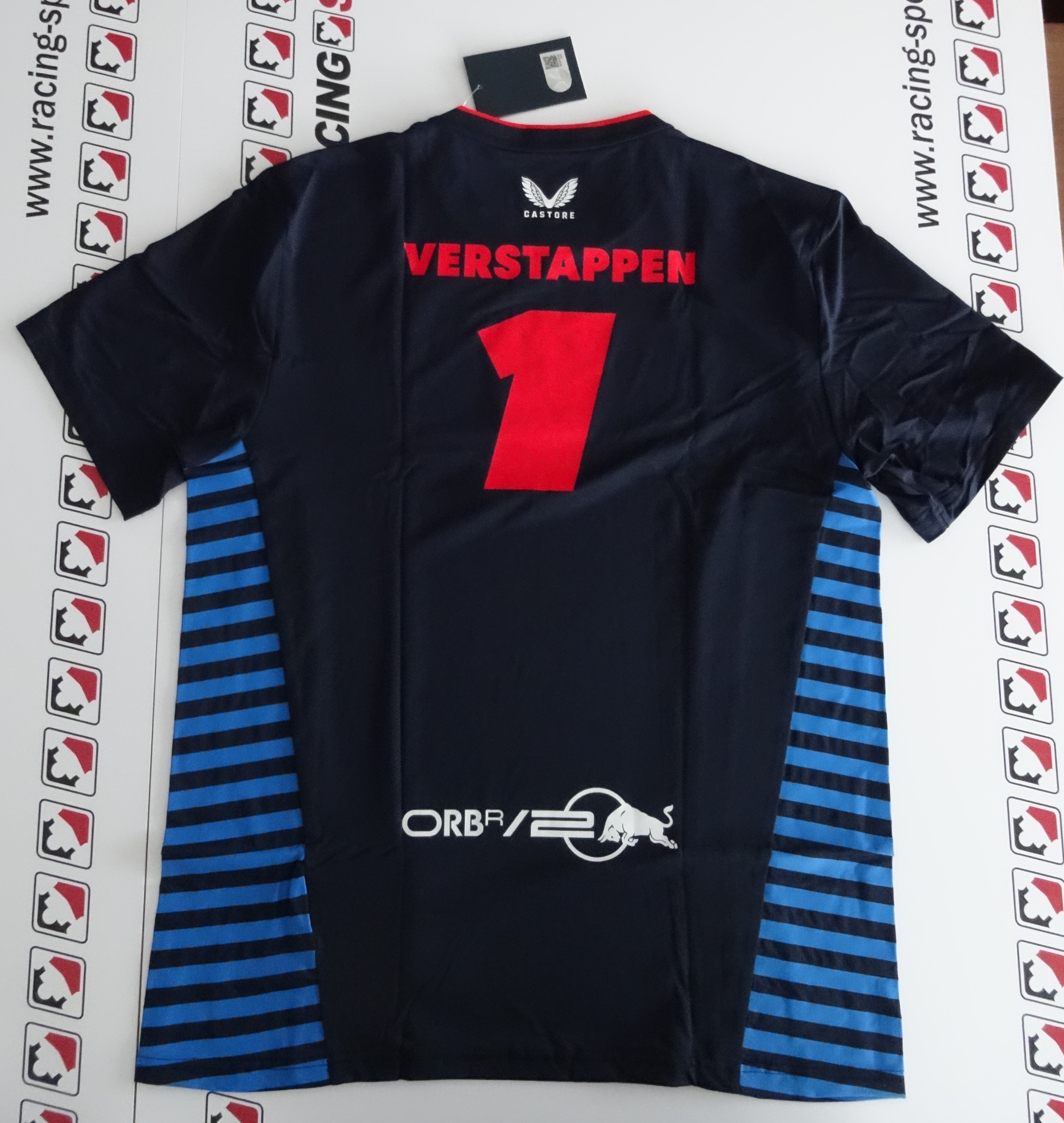 Rückenansicht: Das Highlight für jeden Fan ist die Rückenpartie. In kräftigem Rot prangen hier der Name VERSTAPPEN und die Startnummer 1. Ergänzt wird dies durch die „ORB R/20“-Grafik im unteren Bereich, die den technischen Rennsport-Look vervollständigt.