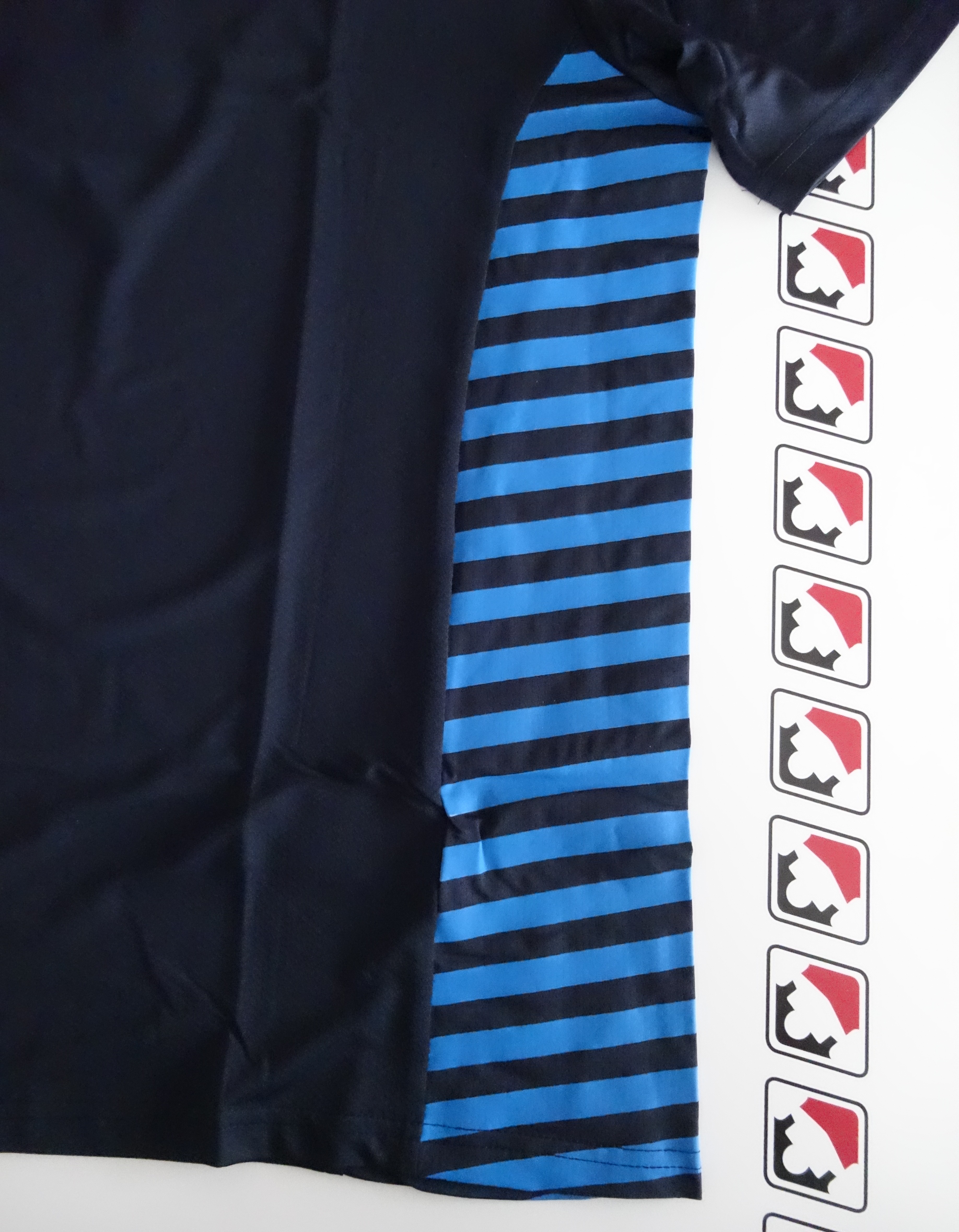 Das Shirt ist im klassischen Deep Navy gehalten und besticht durch ein dynamisches Layout, das direkt von der Boxengasse inspiriert ist. Die seitlichen Chevron-Streifen in abgestuften Blautönen verleihen dem Design Tiefe und führen nahtlos von der Front zum Rücken.